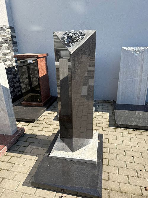 Nowoczesny nagrobek w formie słupa z rzeźbą na posadzce. Nagrobek urnowy lub pojedynczy